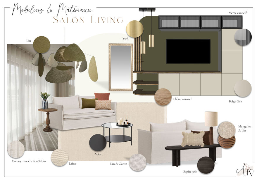 Les goûts de mes clients sont très éclectiques, ils apprécient à la fois le style industriel, rustique, minimaliste tout en restant contemporain. Cependant, il savent qu’ils n’aiment ni le style scandinave ni trop moderne ou bohème. Madame est particulièrement attirée par le style campagne, elle souhaite pouvoir recevoir dans son salon dans une ambiance accueillante et cosy avec des couleurs assez neutres.
