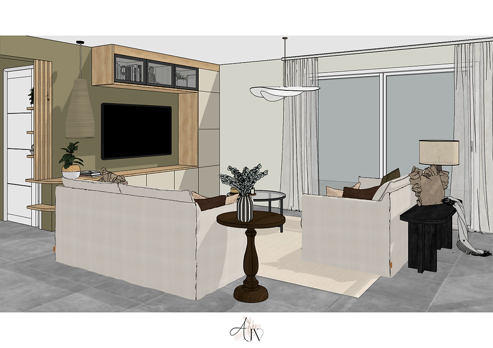 Ma mission principale est donc d’aménager et de décorer l’intégralité de la pièce de vie, tout en s’accordant avec l’existant. Effectivement, mes clients souhaitent conserver le revêtement au sol (carrelage) ainsi que leur cuisine qui leur plaît dans son état actuelle. Ayant déjà engagés un peintre, ils ne souhaitent pas de revêtements particuliers sur les murs (type papier peints, parement, etc…).