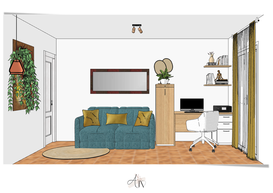 J’opte pour la création d’un espace bureautique composé d’un bureau, d’une armoire et de caissons coulissants, le tout sur-mesure pour s’adapter parfaitement aux dimensions existantes. Pour le coin ‘couchage’, je propose un canapé convertible haut de gamme, aux tons bleu vert, légèrement moucheté de jaune. En version canapé pour le quotidien, facilitant le déplacement dans la pièce et transformable en lit si besoin, avec un véritable matelas pour un confort optimal.