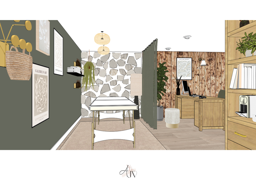 Ma mission principale est de répondre aux besoins de ma cliente, à savoir aménager l’espace et créer une ambiance plus harmonieuse, plus chaleureuse, accueillante et surtout sécurisante. Elle y prodiguera des soins holistiques, des massages bien-être. Ma cliente affectionne tout particulièrement le bois, que l’on retrouve déjà au sol avec du parquet et un mur en lames de pin brulées, et émet le souhait d’acheter des meubles en bois.