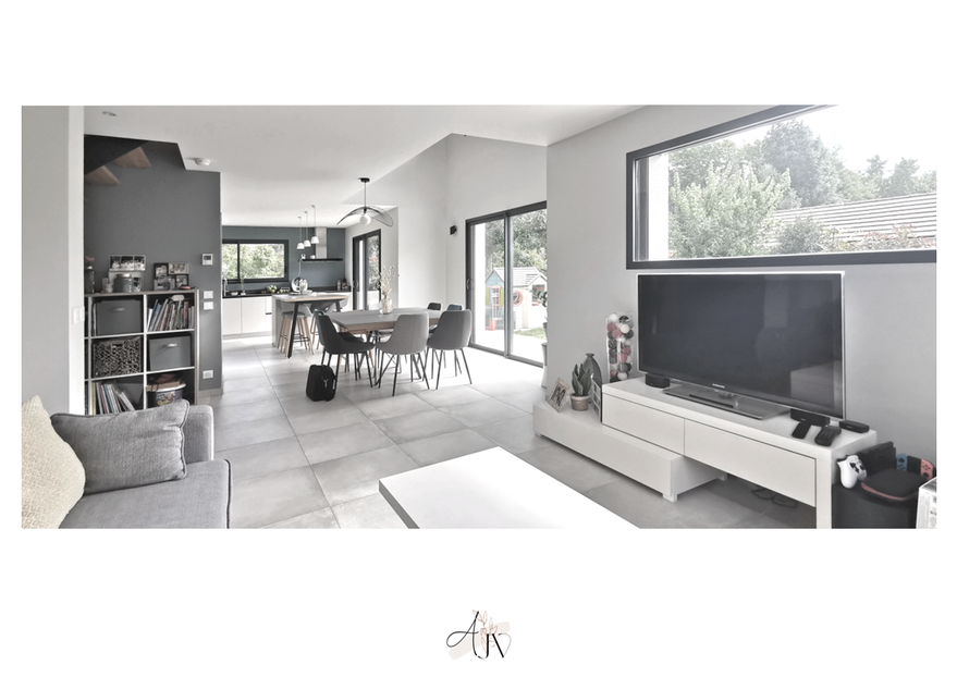 Côté ambiance, un style scandinave et contemporain s’impose pour s’accorder avec celui dans la cuisine et la salle à manger tout en étant chaleureux, confortable et cocooning.
